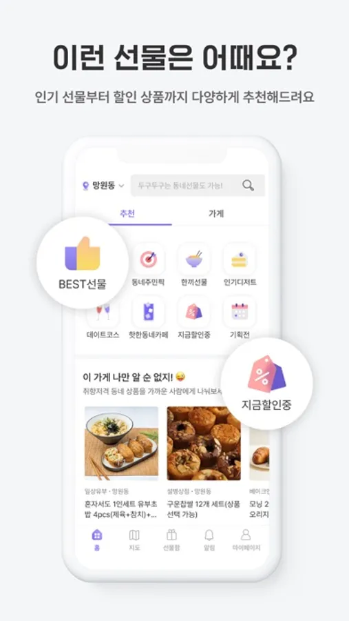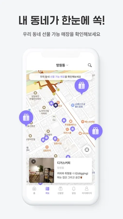개인의 취향과 개성을 담을 수 있는 생생한 오프라인 동네 경험을 주고받는 선물 문화를 선도합니다.