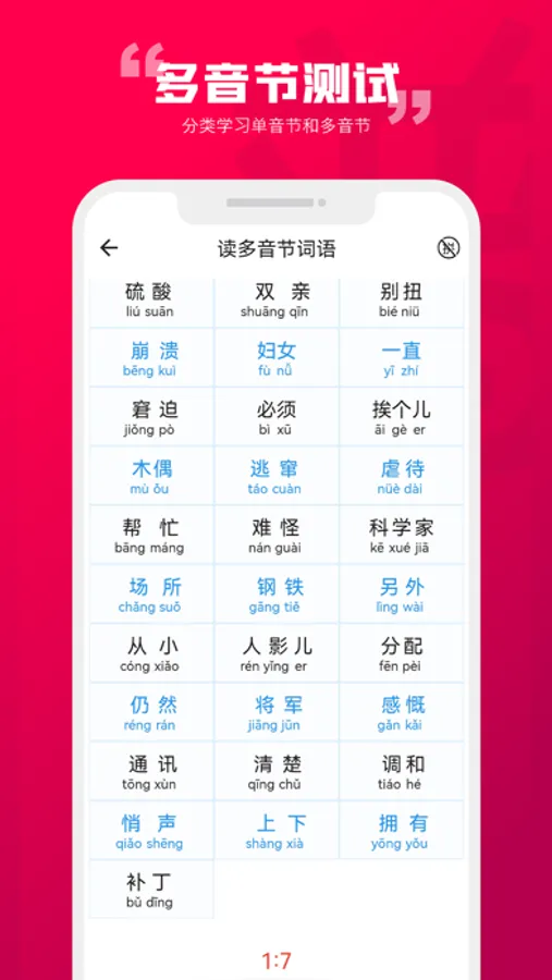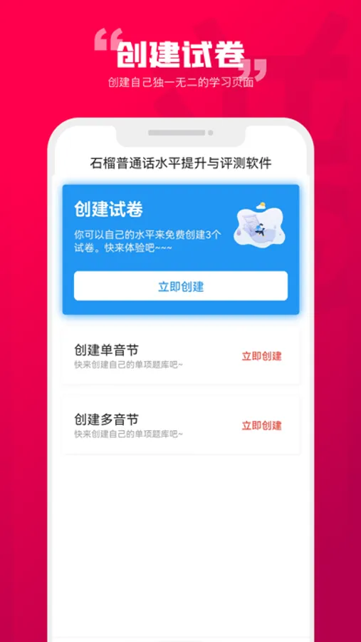 学生可以利用手机软件进行新思想学习、金句子学习、声母发音训练、韵母发音训练、声调发音训练、字发音训练、词语发音训练、成语发音训练、句子发音训练、短文发音训练、命题说话发音训练等。学生在该系统中可以自行设置需要巩固或学习的字词、句子、短文,学习与评测内容不限于固定的考试内容。该系统提供国家普通话水平测试模拟测试功能,提供单音节字词评测、多音节词语评测、朗读短文评测、命题说话自动评测功能。系统中提供语音、视频教学资源,学生可以根据自身需要学习。