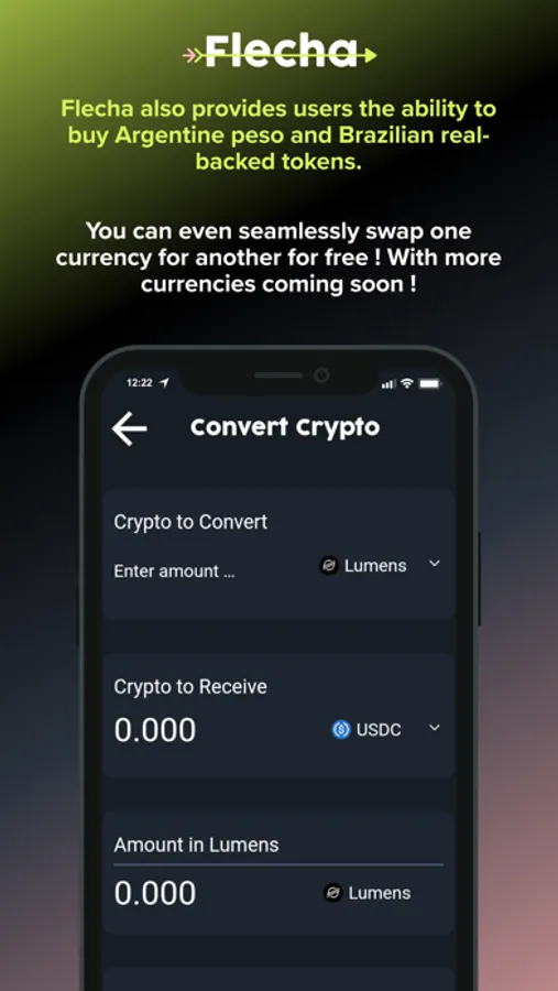 How does it work? Flecha uses revolutionary technology that allows you to buy cryptocurrencies backed by actual US dollars. Flecha also provides users the ability to buy Argentine peso and Brazilian real-backed tokens. You can even seamlessly swap one currency for another for free! With more currencies coming soon !