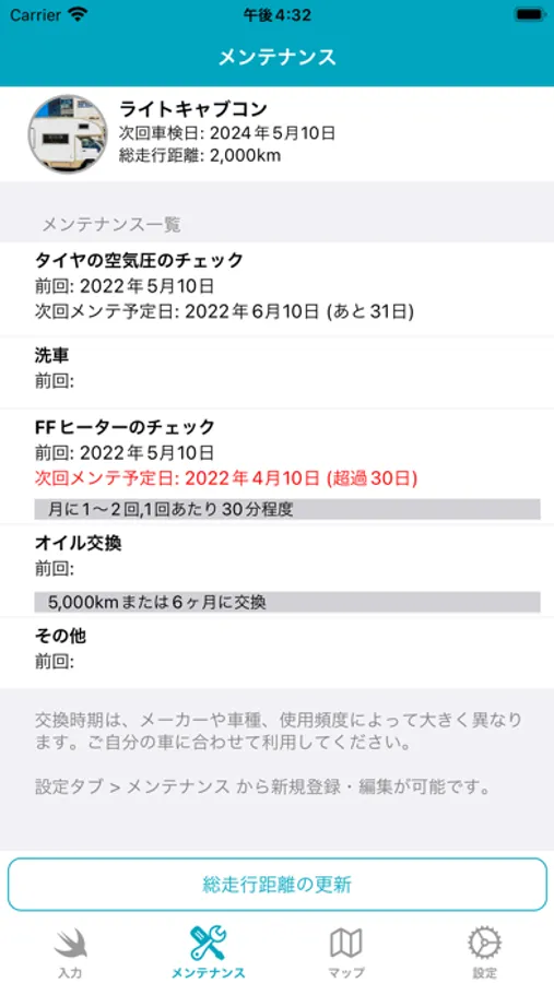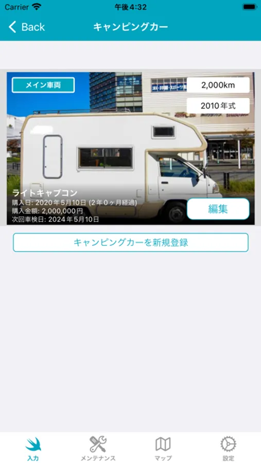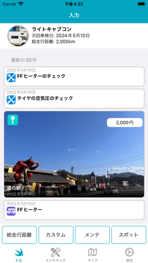 メンテナンス情報や次回の車検、スポット情報などの登録ができます。