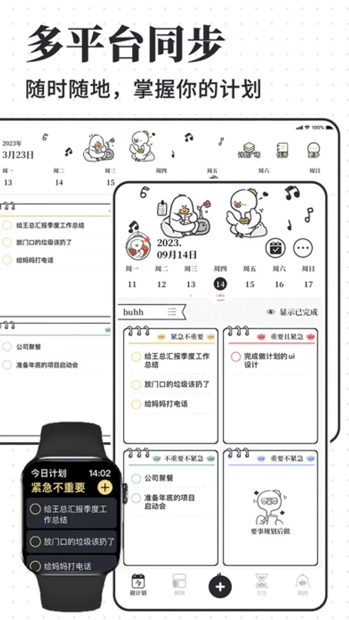 丰富的桌面小组件,支持多种大小、样式及倒数日,展示计划&美化桌面一举多得!打卡签到即可获得新主题和精美贴纸,随心搭配,让做计划变得更有趣,还有超多可爱的图标和头像等你来解锁哦!