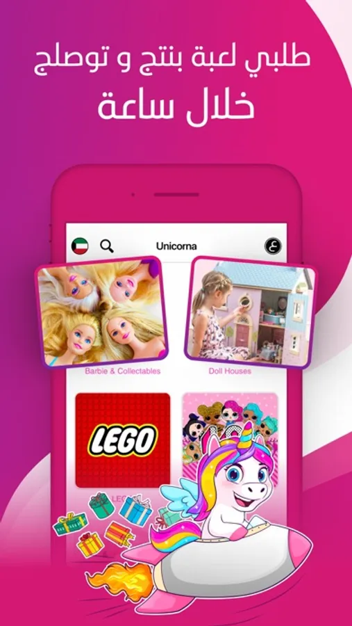 تطبيق يونيكورنا يساعدج توصلين حق هالهدف، من خلال تشكيلة ألعابه، و سرعة توصيله، و أسعاره المناسبة، و هدية صغيرة منا حق بنتج عشان نبي نفرّح بنتج بأقصى طريقة ممكنة!