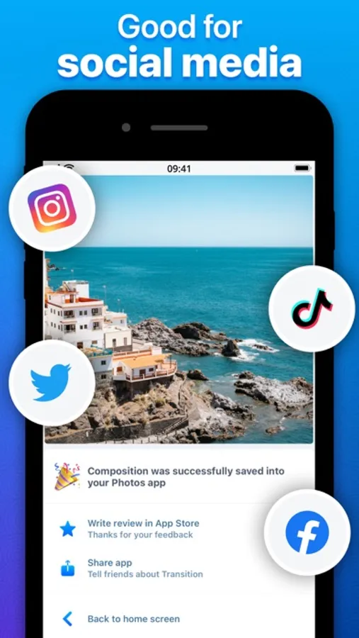 Transition is an app for adding transition effects between your media. You could use it alone to make simple transitions or combine it with other apps in creative ways to get more complex results. Choose your favourite photos and videos and create a beautiful slideshow with just a few taps to share it with friends on Facebook, Instagram, TikTok and more.