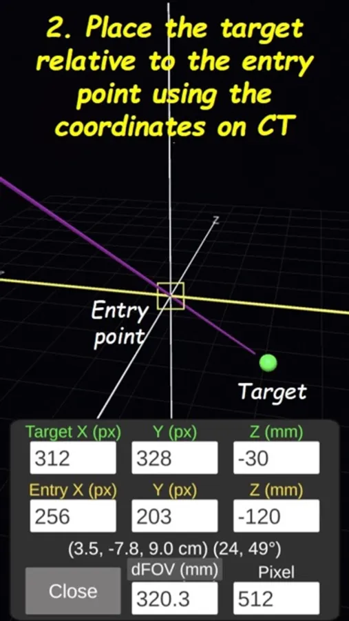 - The target can be placed relative to the entry point by inputting data from the CT images.