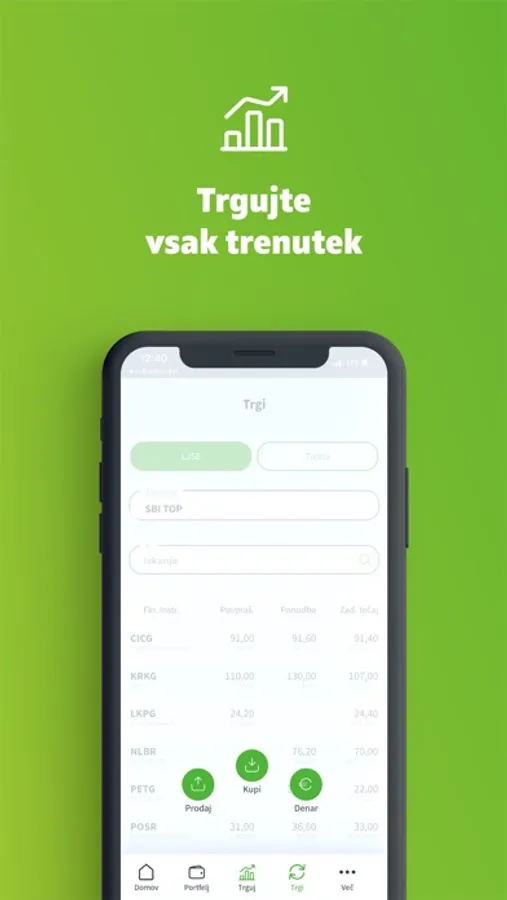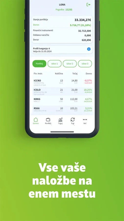 Aplikacija omogoča preprosto oddajo naročil na slovenskem in izbranih tujih kapitalskih trgih kadarkoli in kjerkoli.