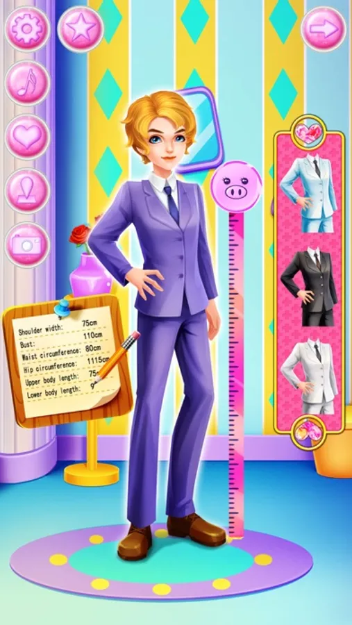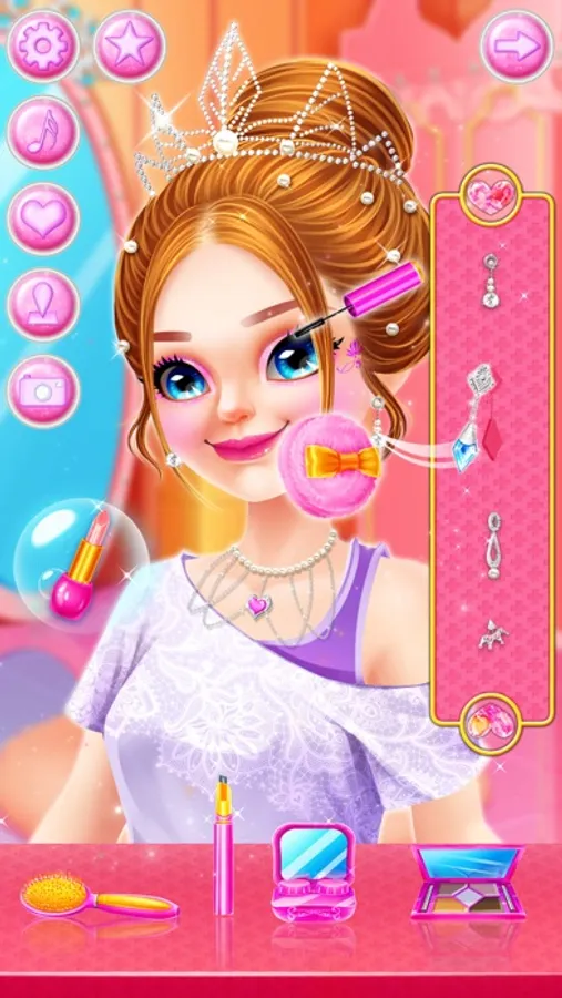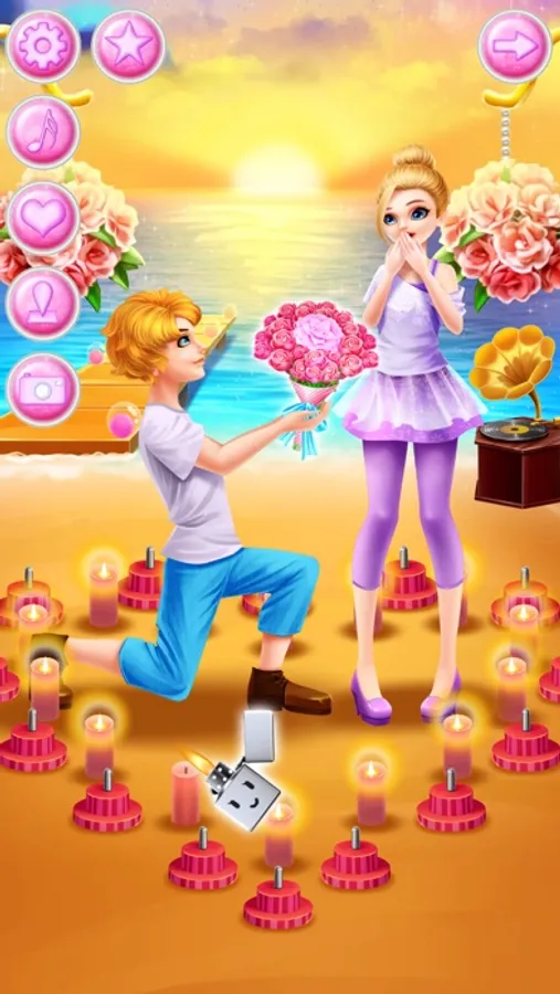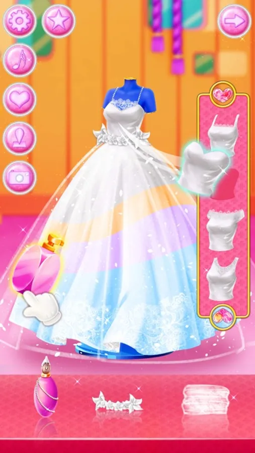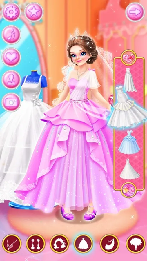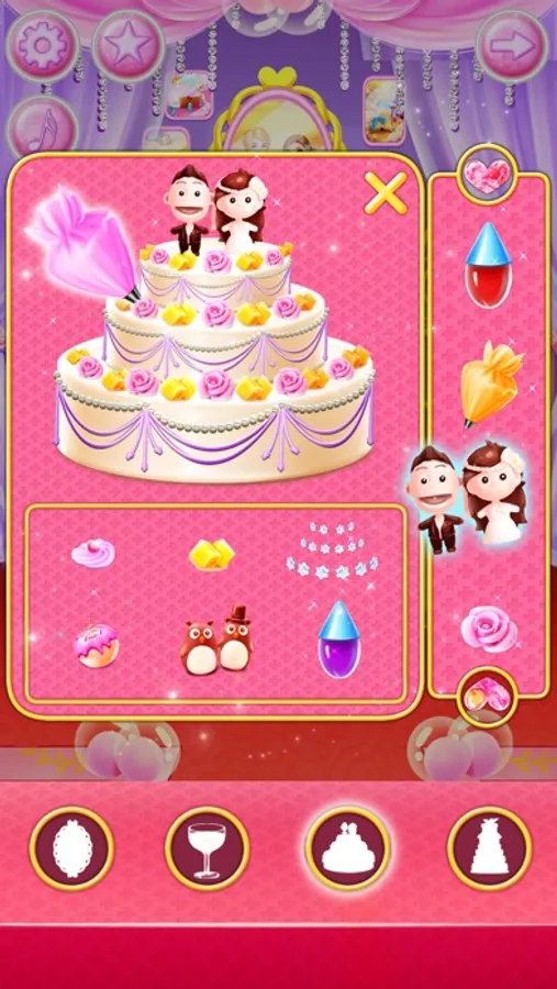 I’ve been invited to George and Kayla’s wedding today. So let’s help our handsome groom and beautiful bride have a great wedding. You can make a handsome evening dress for the groom. You can also design a beautiful wedding dress and bouquet for the bride. Help the bride choose the shinny earrings and necklace, wear a dazzling crown, after dressing up the bride you can accompany the bride to do a premarital beauty, try different styles of exquisite make up. Make delicious dessert cake with a lovely ornament on the top. The bouquet toss is about to begin. Make sure you get it. Finally, shoot a perfect wedding dress for the bride and groom.