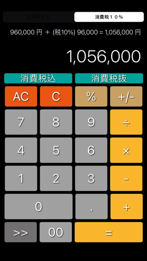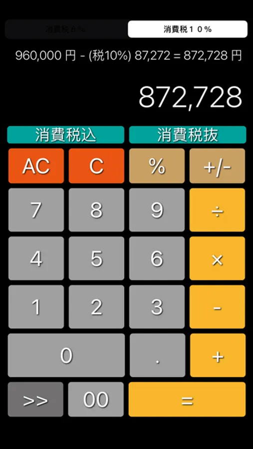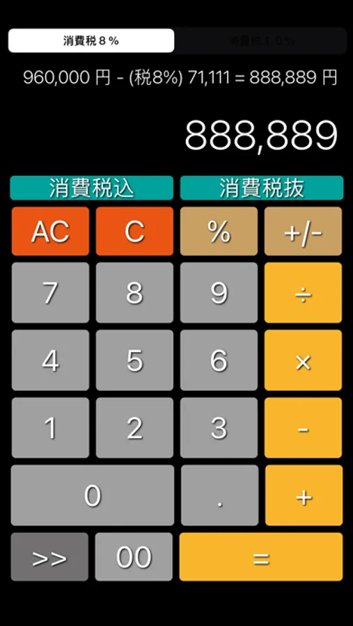 不動産電卓 @返済くんCalc.PRO の消費税部分を抜き出したシンプル電卓です。消費税率は、一般的な10%、食品関係の8%を簡単に選択できます。本体価格と消費税部分(小数点未満を自動的に切捨)の内訳がわかるように計算式を表示。