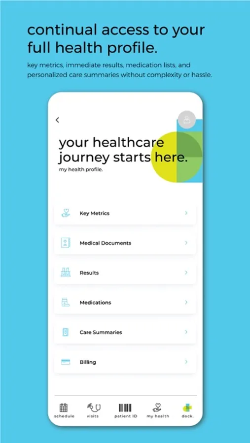 With full access to your health profile including key metrics from every visit, immediate results, easy to track medication lists, and personalized care summaries, the dock. app manages your healthcare journey in one centralized location.