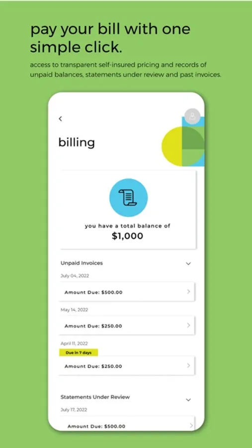 Pay your bill with a simple click, have access to completely transparent self-insured pricing, and records of all bills including unpaid balances, statements under review, as well as past invoices.