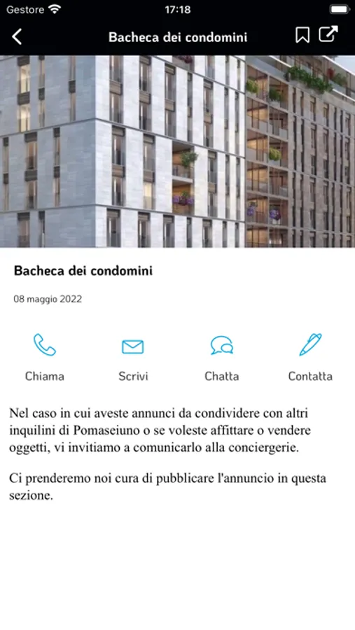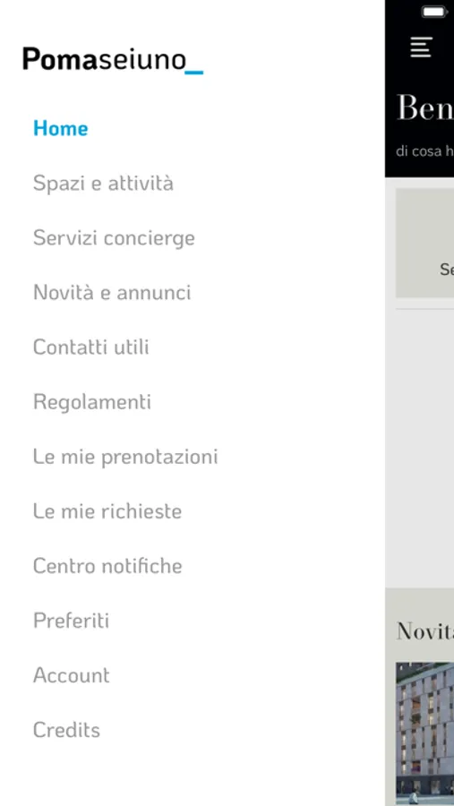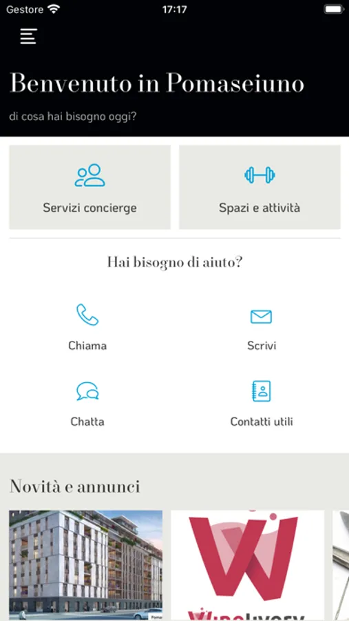 App per visualizzare servizi, attività e spazi presso Pomaseiuno, effettuare prenotazioni e contattare il concierge.