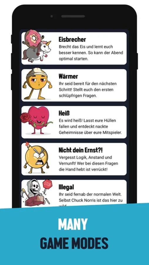 The party game is more than just an icebreaker. There is a suitable game mode for every situation. From WARM to HOT to EXTREME. The game is perfect to slowly feel out and get to know new people. And after that it gets hot ;)