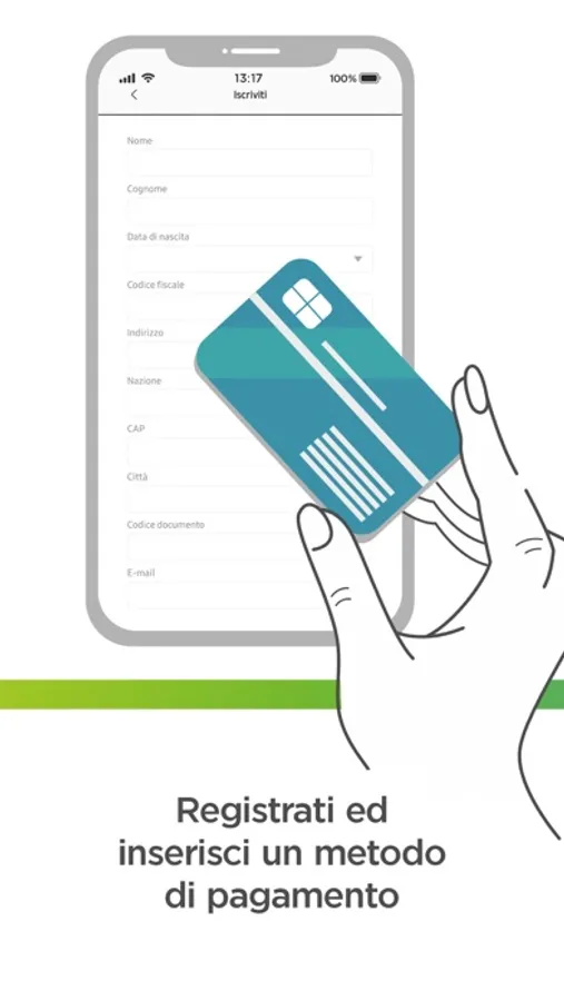Scarica l’App e crea il tuo account. Tieni a portata di mano il tuo documento di identità/passaporto, la tua patente e la carta di credito/debito.