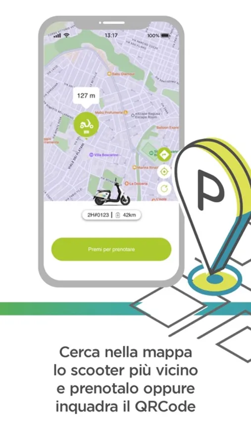 Seleziona nella mappa l’E-scooter più vicino a te, prenotalo e raggiungilo entro il tempo indicato. Altrimenti inquadra direttamente il QR Code posizionato sul cruscotto o inserisci il codice alfanumerico per verificare che l’E-scooter sia disponibile.