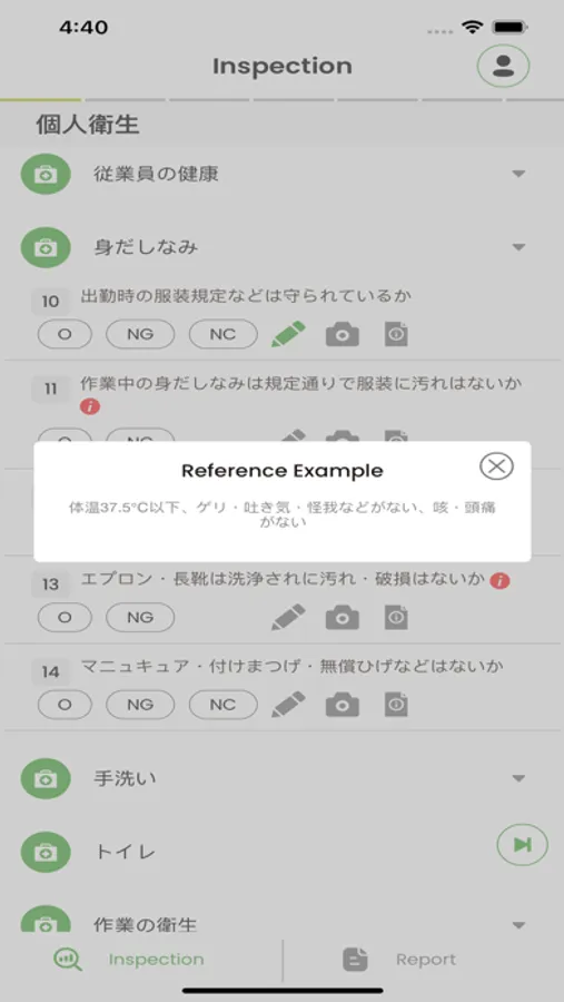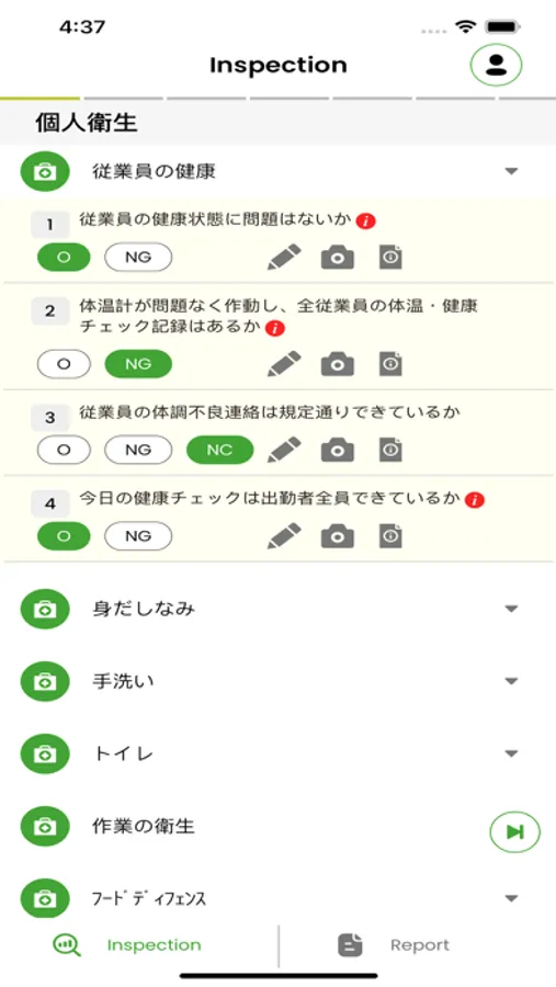 3. The worker confirms the inspection plan, starts the inspection at the designated place and time, and carries out the inspection according to the specified checklist. It is possible to add photos and comments in addition to the evaluation for each item.