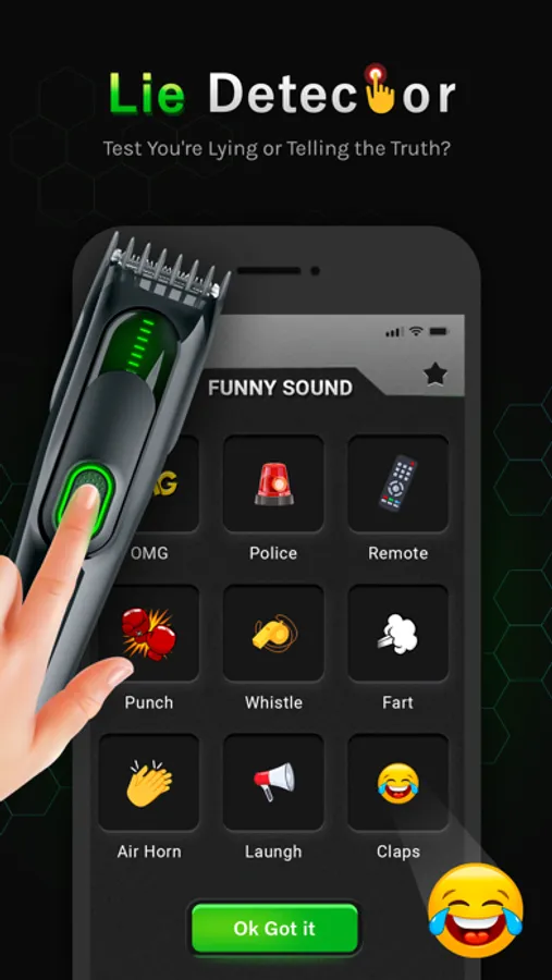 - Enjoy lie detector with lots of funny sound like Ghost, Rat, Horse, Broke, Door, cat, Dog, Fart, OMG, Police, Remote, Punch, Whistle, Claps, Air Horn, Laugh, Hair Clipper