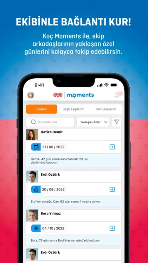 İyi günde kötü günde, hastalıkta sağlıkta, doğum gününde, karne gününde… Koç Moments, ekip arkadaşların için özel olan günleri hatırlatmak için seninle! Ekibindeki çalışma arkadaşların için önemli olan günleri takvimde kolayca görebilirsin. Ayrıca Koç Moments yaklaşan önemli günlerden seni haberdar eder.