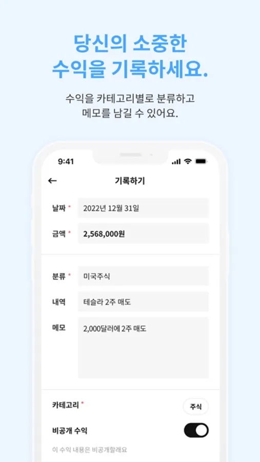 소중하고 다양한 수익들을 기록하세요. 수익을 카테고리별로 분류하고 메모를 남길 수 있어요.
