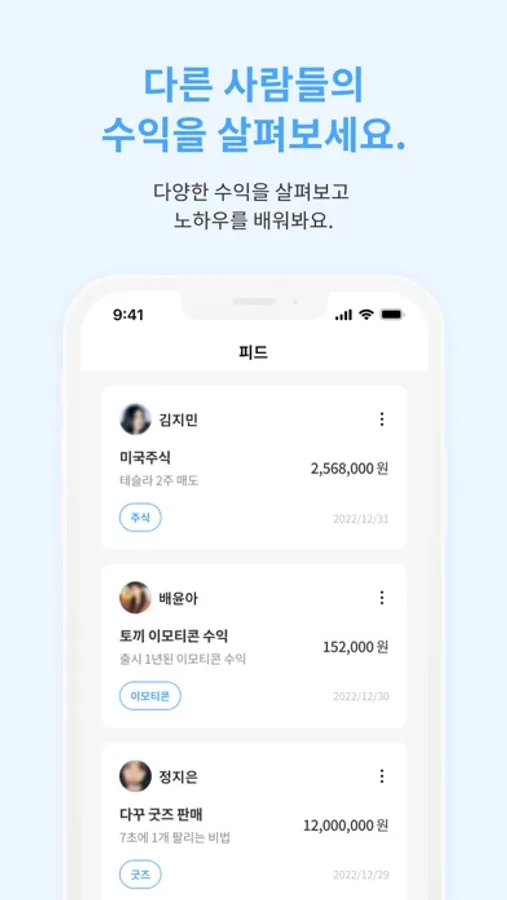 내 수익을 공유하고, 다른 사람들의 수익도 살펴보세요. 나와 비슷하게 수익을 창출하는 사람과는 친구가 되고, 나와 다른 방법으로 수익을 창출하는 사람에겐 노하우를 배울 수 있어요.
