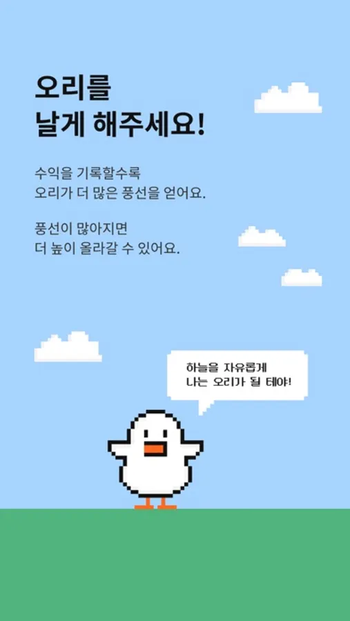 수익을 기록할수록 오리가 더 많은 풍선을 얻어요. 풍선이 많아지면 점점 높이, 더 멋진 풍경의 하늘까지 날 수 있어요. 오리에게도 당신에게도 멋진 일들이 벌어질거에요!