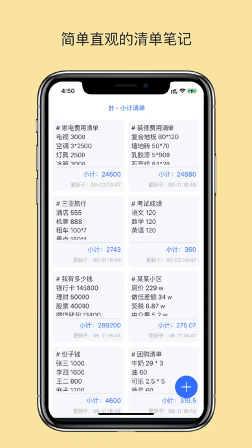 小计清单是一个轻量的记账工具,你可以在记录文字的过程中进行计算。