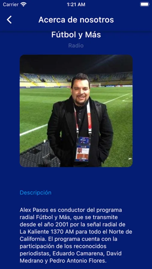 Alex Pasos es conductor del programa radial Fútbol y Más, que se transmite desde el año 2001 por la señal radial de La Kaliente 1370 AM para todo el Norte de California. El programa cuenta con la participación de los reconocidos periodistas, Eduardo Camarena, David Medrano y Pedro Antonio Flores.