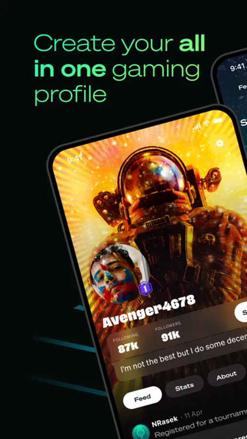 Customize your gaming profile with playstyle, preferences, location, unique avatars, and banners. Stay updated on your gaming community by following friends and favorite creators.