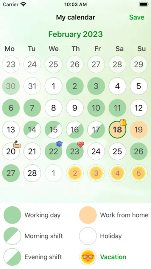 My Calendar/Shift schedule - simple application for your shift schedule. The helpful user interface allows easy set working days, holidays, vacations, work from home, and making notes.