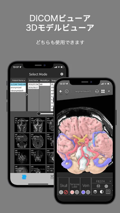 医用画像(DICOM)ファイルや3Dモデル(STL, OBJ, FBXなど)を閲覧できます。