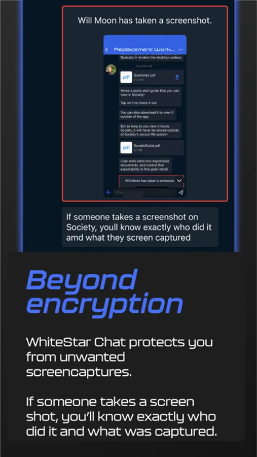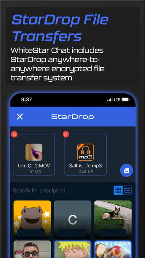 Sending fully secured files to your team and clients can be a serious headache. Luckily, WhiteStar Chat’s StarDrop file transfer system makes file sharing a breeze. StarDrop allows you to send encrypted files anywhere in the world between your devices without the need to store files in the Cloud. This means you can send important files to your team and clients without the worry of your files being leaked or compromised. Even better, StarDrop eliminates potential human error in the transfer of sensitive data - that way you can focus on what you do best, and let us be the cybersecurity experts in backing you up.