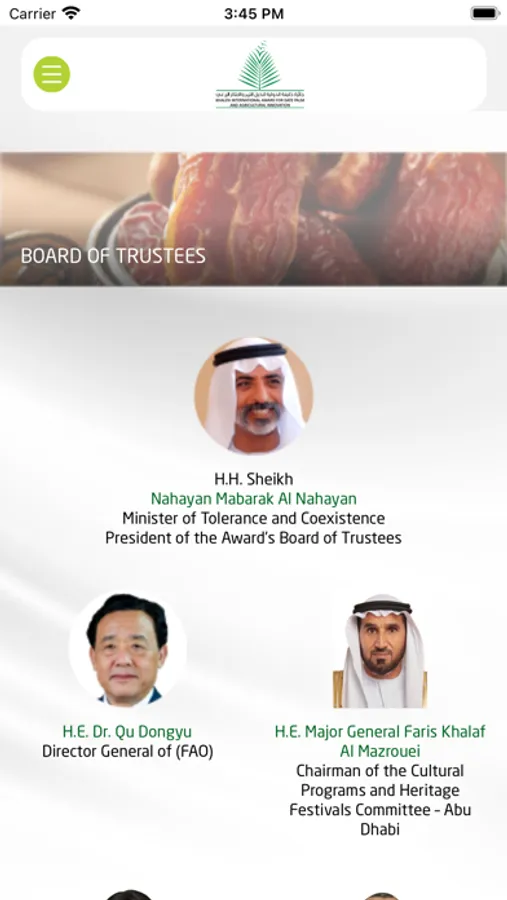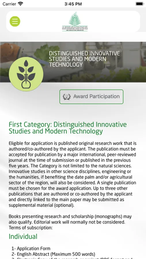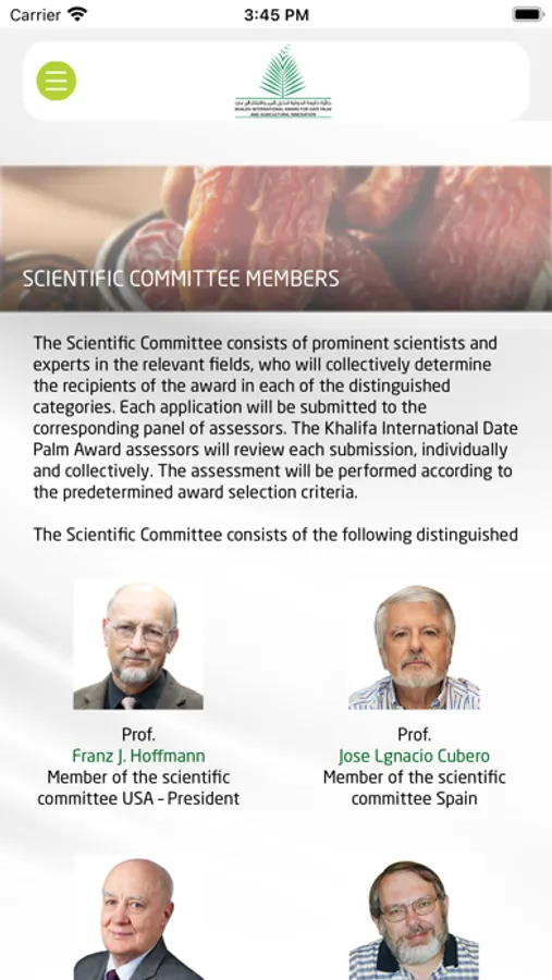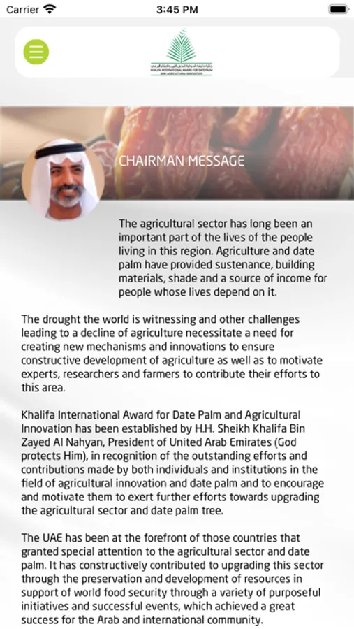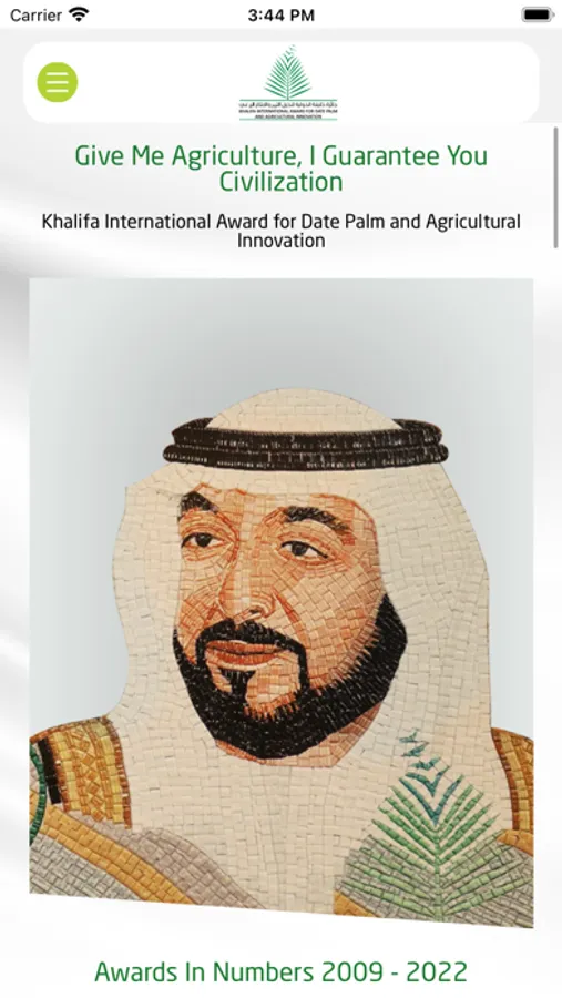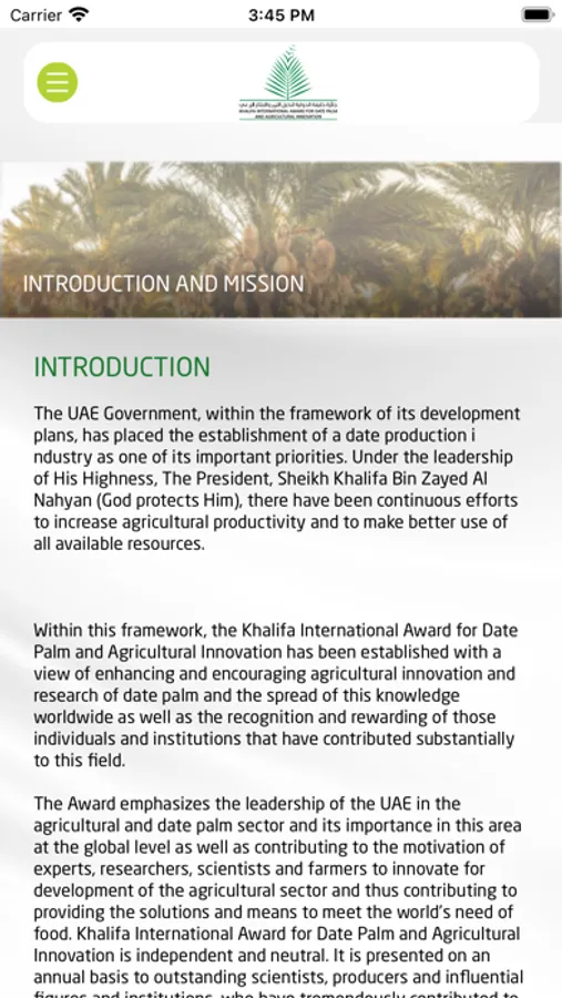 Purpose of the app is promotional for Khalifa International Awards for Agricultural Innovation; In order to To encourage people involved in the agricultural sector and date palm cultivation, whether researchers, growers, exporters, institutions or world companies and agencies, to adopt innovations.