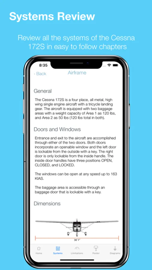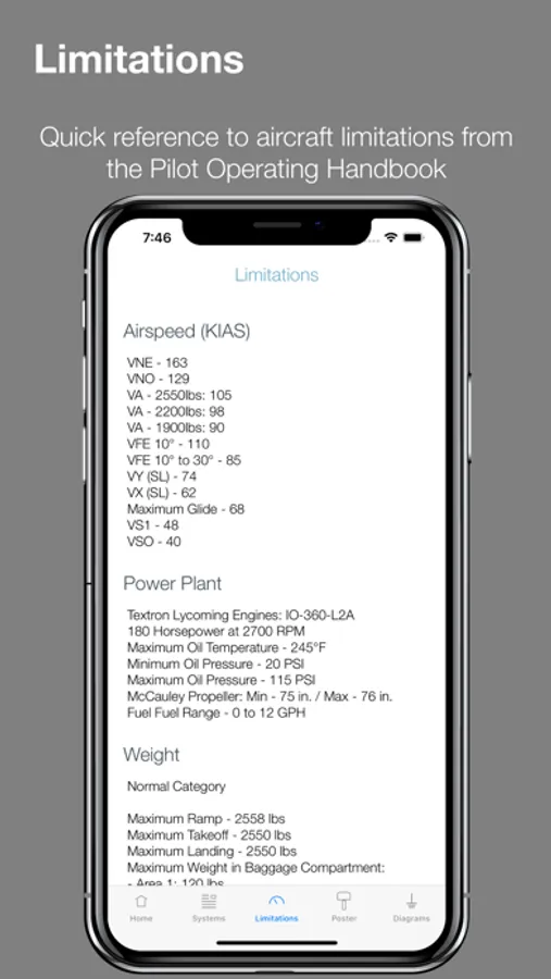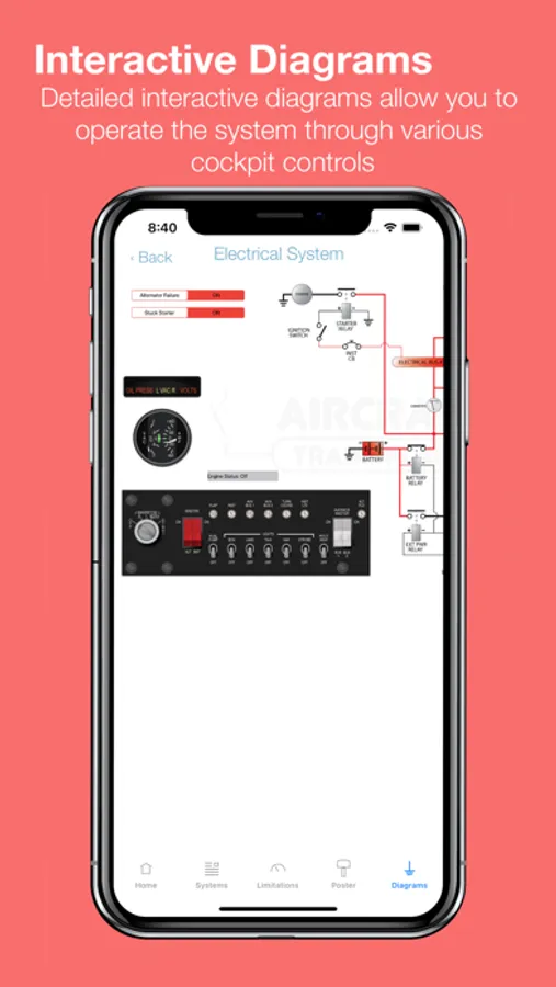 Interactive diagrams for the major systems allow the user to tap on various switches, levers, circuit breakers, and buttons and watch how those inputs change the diagram. Users can practice normal and emergency operations, correlating practical knowledge with the POH descriptions. Descriptions and limitations are also noted for various parts of each system throughout the diagram.