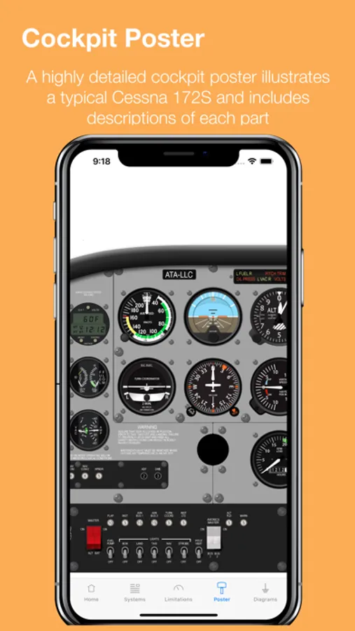 The interactive cockpit poster allows you to view the entire cockpit with a highly detailed illustration. If you tap on a part of the cockpit you will see an in-depth description of that part of the cockpit.