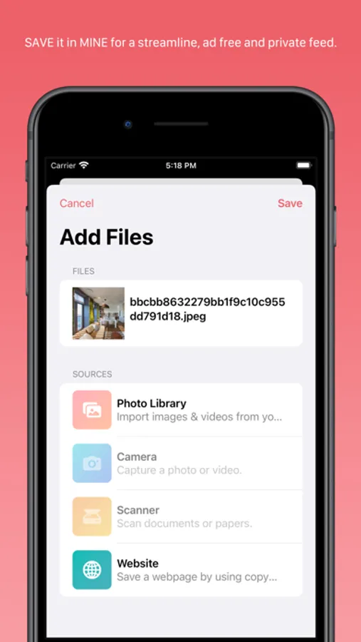 MINE’s Share extension makes it easy to import inspirations from any app. Whether you're browsing the web, scrolling through social media, or reading an article, simply tap the Share button and select the MINE icon. With the Share extension, you can save, tag and organize your inspirations directly to MINE without ever leaving the app you're in.