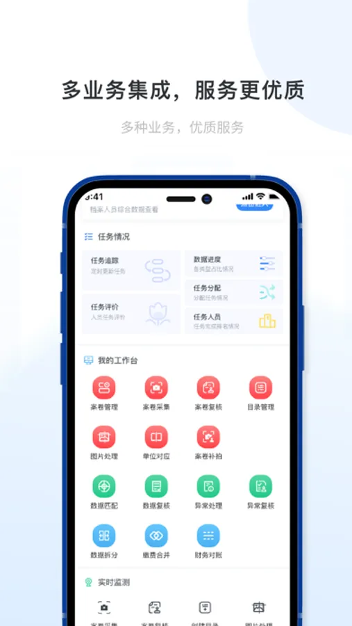 【工作台】多种业务集合,服务更加优质。档案数据的整编工作:案卷采集,复核,创建目录,单位对应等基本功能支持在移动端部分进行快捷操作;档案中的检索查询档案人员信息;根据任务分配,实现档案的线上智能办公,办公更高效;实时监测各环节进度,便于查缺补漏;