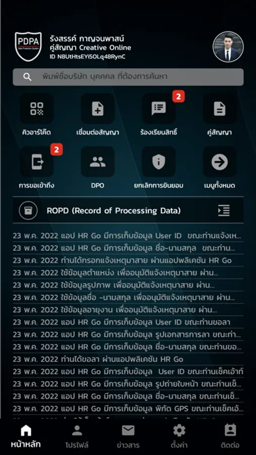 2) Privacy Policy / Privacy Notice ฟังก์ชันการบรอดนโยบายการเข้าถึงข้อมูลส่วนบุคคล ผ่านระบบ App DPA Pro ให้เข้าถึงพนักงาน ลูกค้า หรือผู้เยี่ยมชมองค์กร ผ่านทางโทรศัพท์มือถือ
