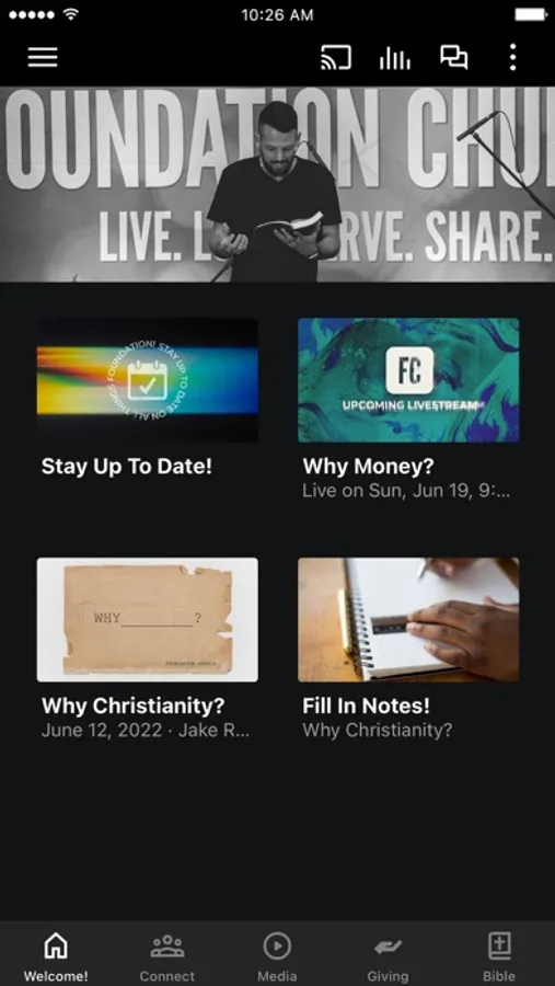 This app will help you stay connected with the day-to-day life of our church. With this app you can: watch or listen to past messages; stay up to date with push notifications; share your favorite messages via Twitter, Facebook, or email; and download messages for offline listening.
