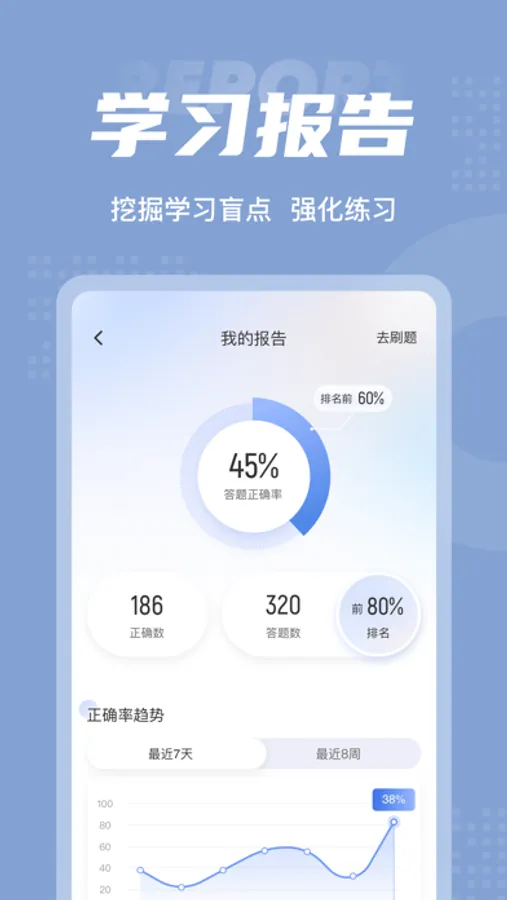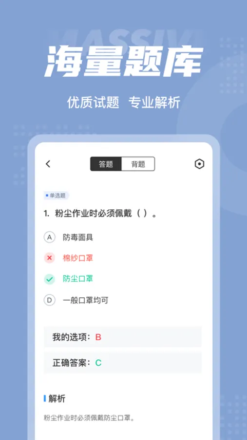 职业病诊断医师题库内含考点练习,全国通用卷以及地区卷模拟练习,以及按照固定考试比重的随机式的抽题的真题考场,成绩单实时记录考试数据,一点一滴的反馈考生近期学习状态以及自我正确率的提升,大大的给予考生通过考试的信心。