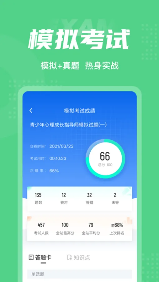 青少年心理成长指导师题库内含考点练习,全国通用卷以及地区卷模拟练习,以及按照固定考试比重的随机式的抽题的真题考场,成绩单实时记录考试数据,一点一滴的反馈考生近期学习状态以及自我正确率的提升,大大的给予考生通过考试的信心。