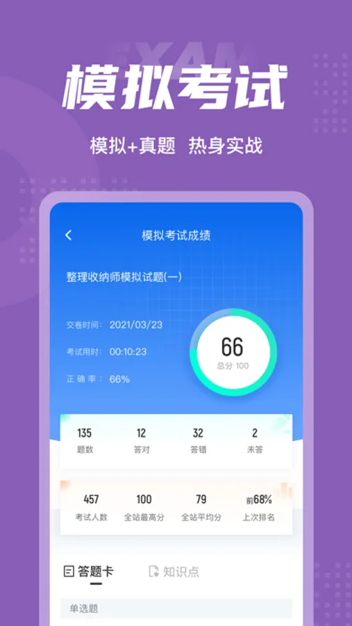 整理收纳师题库内含考点练习,全国通用卷以及地区卷模拟练习,以及按照固定考试比重的随机式的抽题的真题考场,成绩单实时记录考试数据,一点一滴的反馈考生近期学习状态以及自我正确率的提升,大大的给予考生通过考试的信心。