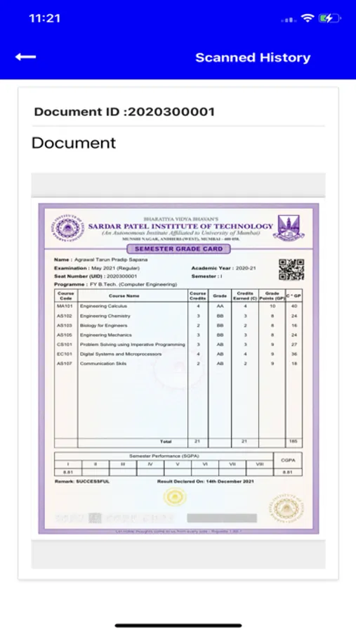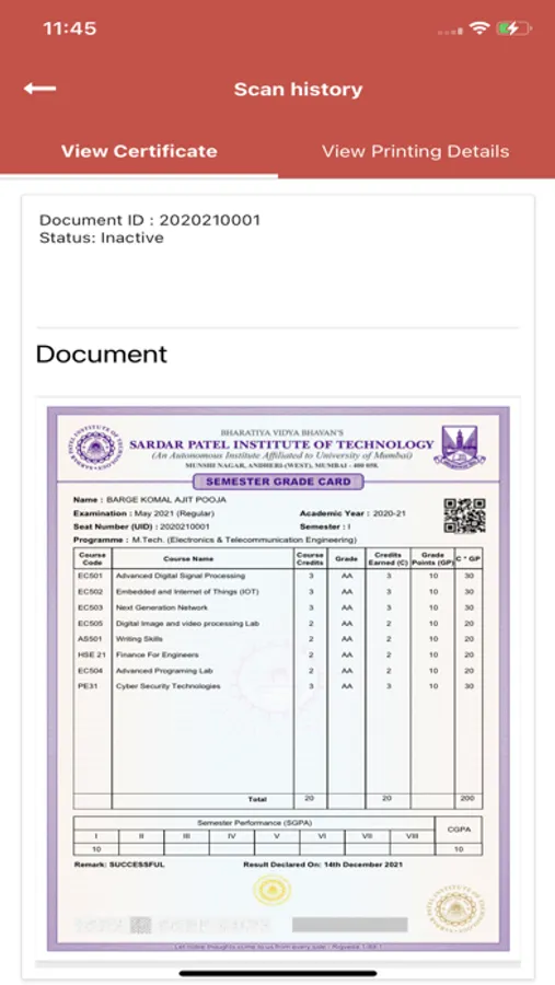 This application, after scan, provides the preview of the certificate and other document data that can be compared with the in-hand document. Thus verifying documents of Sardar Patel Institute of Technology is quick, free and easy via this application