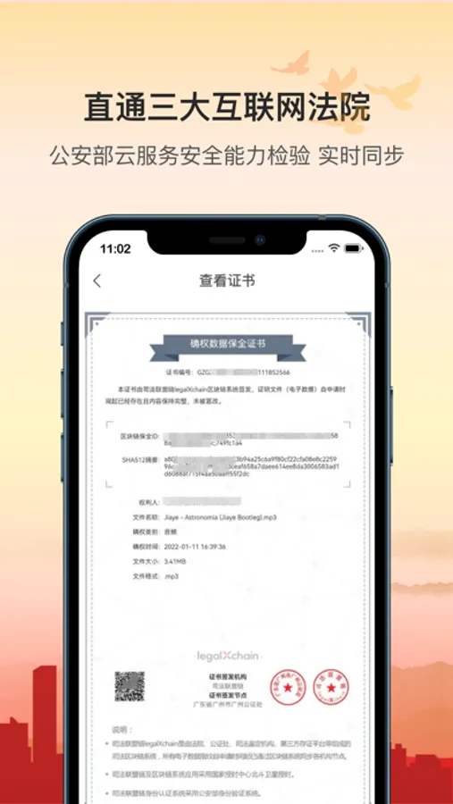 满足执法人员和个人取证的强烈需求,提供高保真现场录音,高清拍照,高清摄像等取证功能。并采用公安部主体身份识别系统,在用户进行取证时,将数据实时上传云端加密保存。