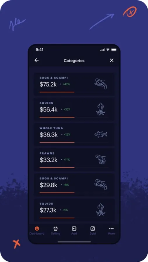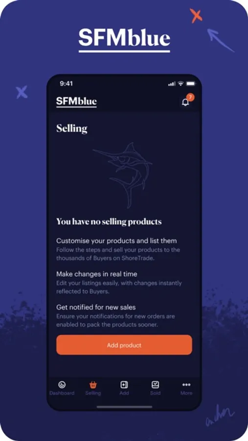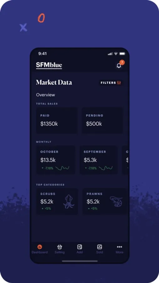 With SFM Blue, Sellers have the ability to distribute and sell seafood at their fingertips, whether it’s from out in the seas or back on land. Engineered to function with light limitations, eye sensitivities and signal issues whilst out at sea, this app is designed to thrive in all fishing environments.
