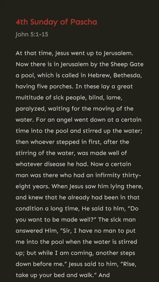 The Gospel Desk App focuses on one story each day, chosen from the Gospels of Saints Matthew, Mark, Luke, and John. The curated selections follow the lectionary of the Orthodox Church in America, a yearly cycle connecting you to thousands of years of Tradition and hundreds of millions of fellow believers around the world.