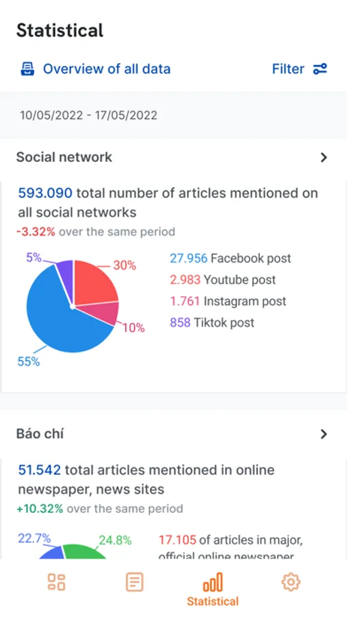 + Multi-channel data collection: Collecting information by keywords from newspapers, Facebook, Youtube, forums