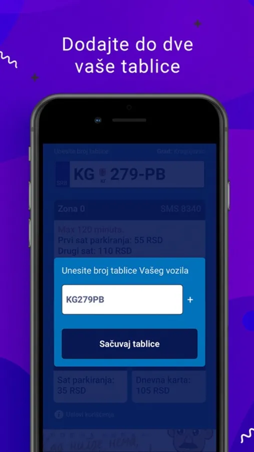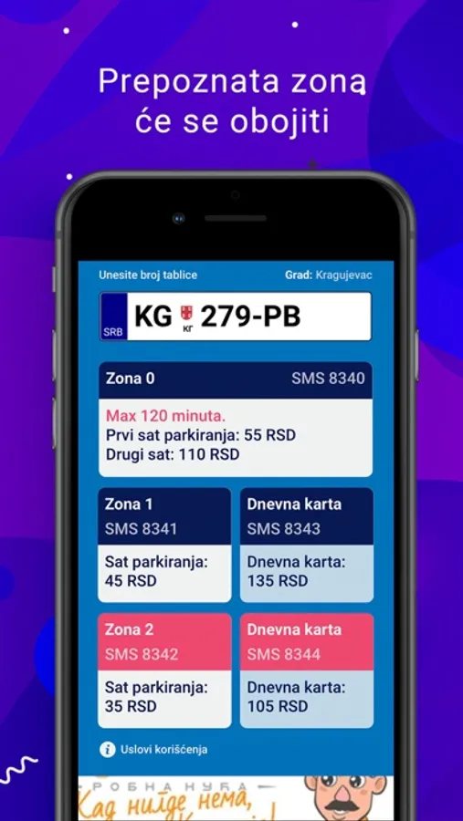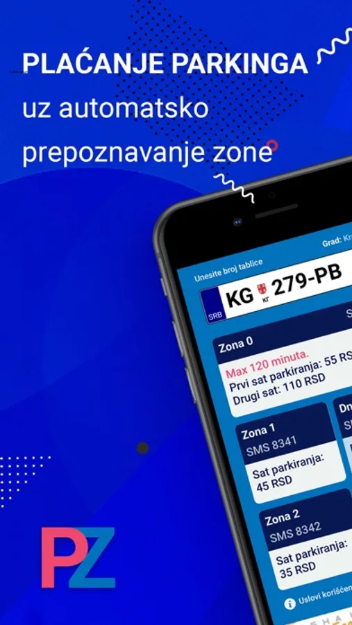 Aplikacija nudi automatsko prepoznavanje parking zone u kojoj se nalazite i omogućava Vam lako slanje SMS-a za plaćanje parkinga. Pokriveni su gradovi Vranje, Požarevac, Ivanjica, Bačka Palanka, Vršac, Smederevo, Pančevo, Kraljevo, Trstenik, Vrnjačka Banja, Kruševac, Šabac, Sremska Mitrovica, Zrenjanin, Leskovac, Subotica, Beograd, Jagodina, Kragujevac, Niš, Novi Sad, Paraćin, Aranđelovac, Čačak, Sombor.