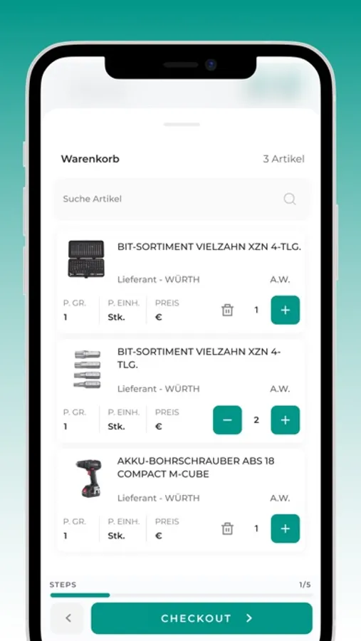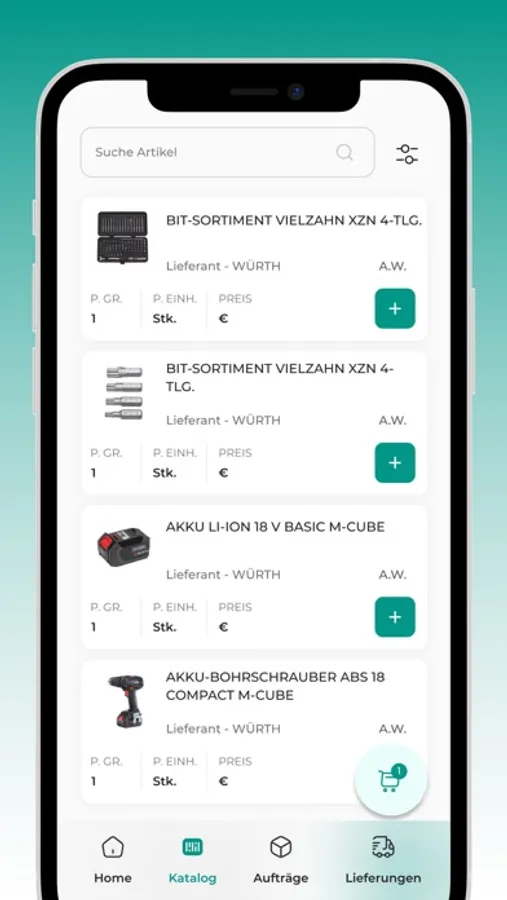 Definieren von Kategorien nach Warengruppen, Bauabschnitten sowie vordefinierte Warenkörbe für den Abruf, die termintreu mit allen Lieferanten von der Baustelle oder dem Büro geteilt werden können.