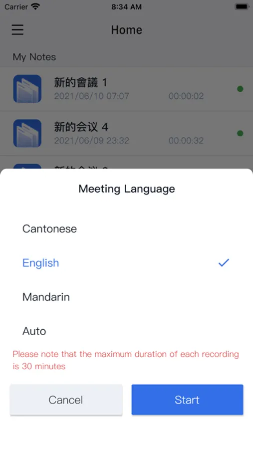 Callinter Lite supports Cantonese (mixed with English), Mandarin (mixed with English), and English. You can also try the “Auto” mode that would automatically detect what language you speak and try to convert your voices into texts.