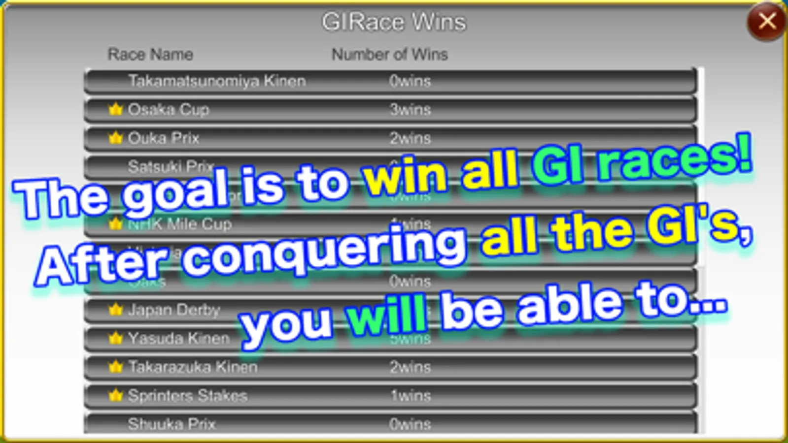 - A large number of GI races are available, including Arima Kinen, Japan Derby, Japan Cup, Kikka Sho, Shukka Sho, Osaka Cup, and Mile Championship. You can also aim for the Prix de l'Arc de Triomphe, a long-cherished dream of Japanese horses.