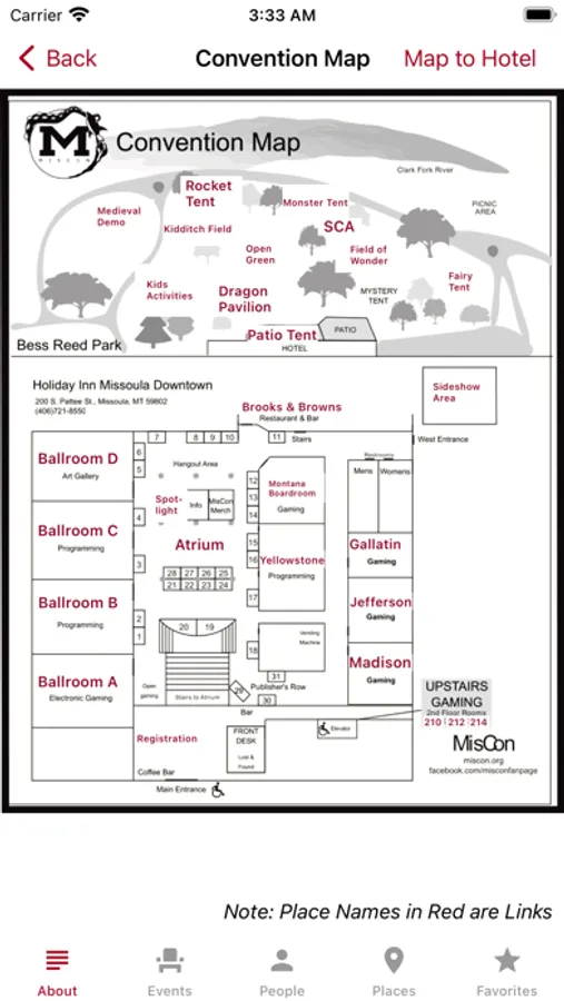 -An interactive Map of the venue, and location-specific event listings, with map location highlighting