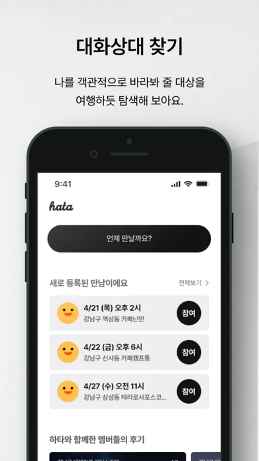 하프타임 HATA는 여행지에서 우연히 낯선 사람을 만나 이야기를 하듯, 나를 전혀 모르는 누군가와의 대화를 통해 타인을 이해하고 나를 알아가는 시간을 일상에서도 가질 수 있었으면 하는 바램에서 시작되었습니다. 작은 설렘과 흥미로운 스토리, 간접경험 등 그 과정에서 얻게 되는 선물 같은 시간을 함께 나누었으면 합니다!
